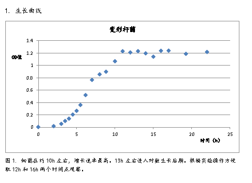 1、 將普通變形桿菌菌種在5ml NA液體培養(yǎng)基中活化,活化的菌種接種于100ml NA液體培養(yǎng)基中,37℃搖床中培養(yǎng),接種后立即取0.1ml測(cè)量OD值,后連續(xù)22h取菌液測(cè)其OD值,并繪制實(shí)驗(yàn)菌株的生長(zhǎng)曲線。