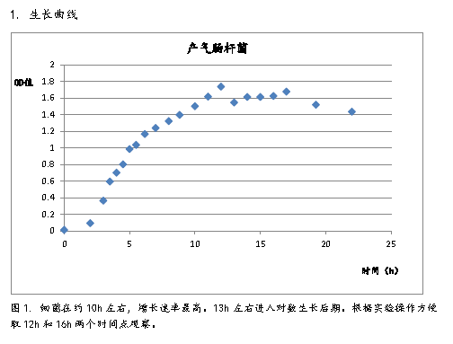 1、 將產氣腸桿菌菌種在5ml NA液體培養基中活化,活化的菌種接種于100ml NA液體培養基中,37℃搖床中培養,接種后立即取0.1ml測量OD值,后連續22h取菌液測其OD值,并繪制實驗菌株的生長曲線。